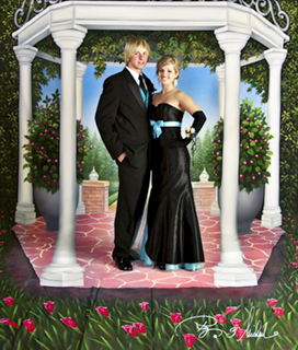 Perhaps the most ingenious and inspired of our three-dimensional Escher-like backgrounds, "Call Me Flowers" irresistibly tricks the eye into believing that the two pillars are really in front of the couple when in fact, it's all a magical sleight of "trompe l'oeil" art, a term that virtually no one can pronounce properly, mostly because it's French, and when Americans feel compelled to call french fries, "freedom fries," well, that says it all about the French.
